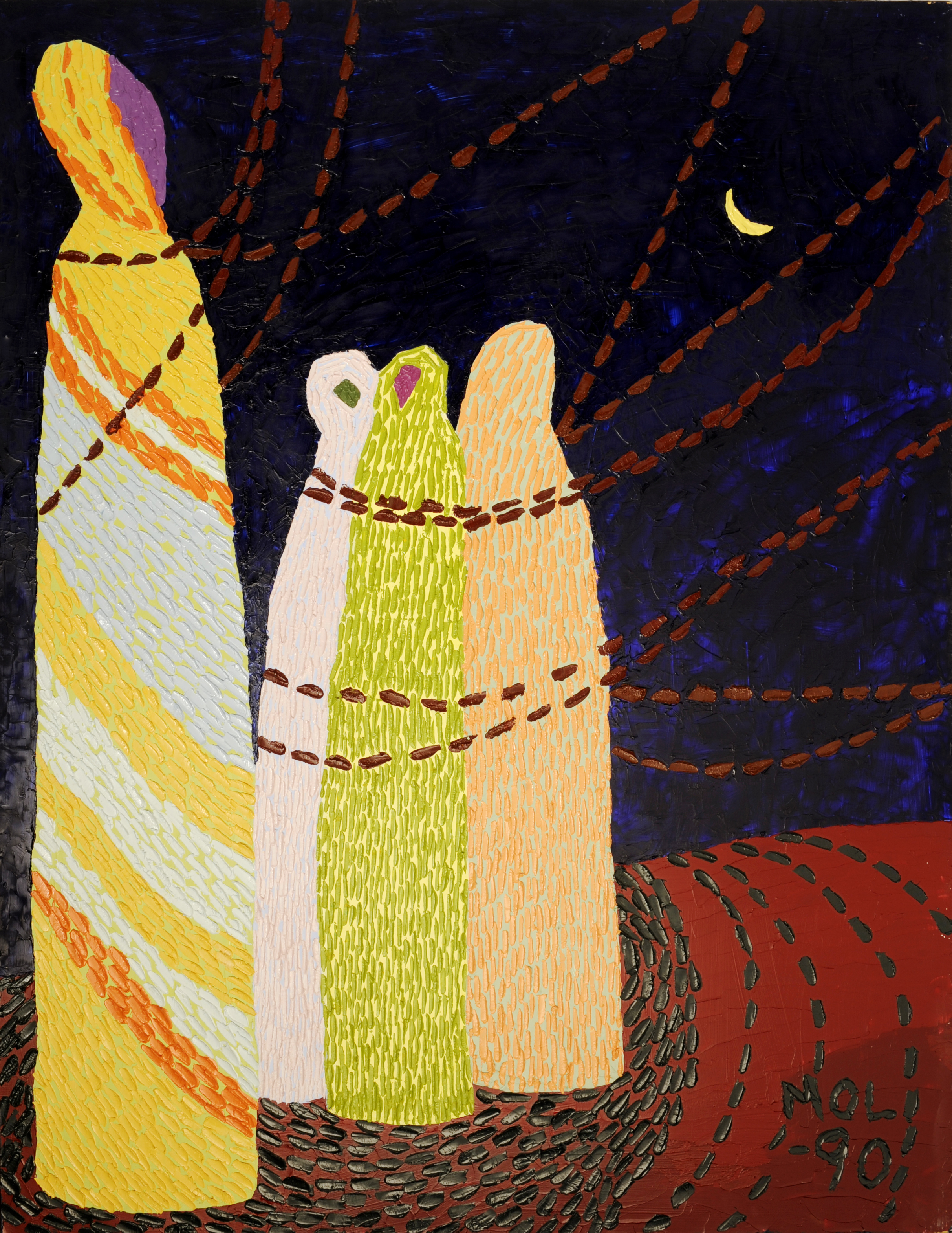 Kädettömiä, avuttomia ja vielä sidottujakin! Tumma taivas ja kuun sirppi tuovat varjonsa. Kuun kalpea valo ei riitä antamaan valoa.